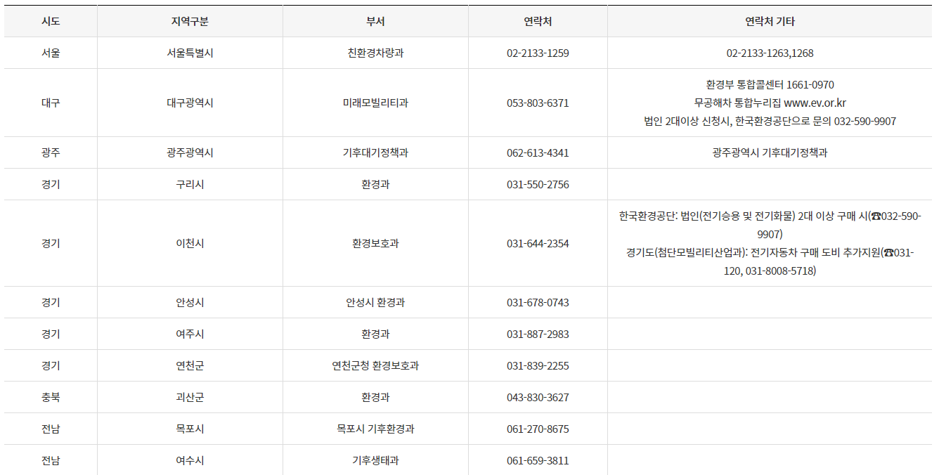 전기차 보조금을 신청할 때에는 다음 지자체에 문의하시면 됩니다.
